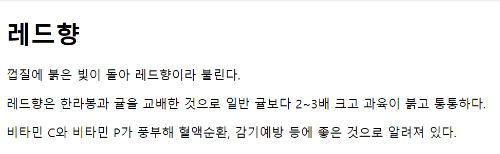 <p>레드향은 <em>한라봉과 귤을 교배</em>한 것으로 <br>일반 귤보다 2~3배 크고 과육이 붉고 통통하다.</p>