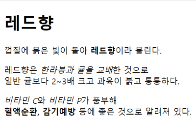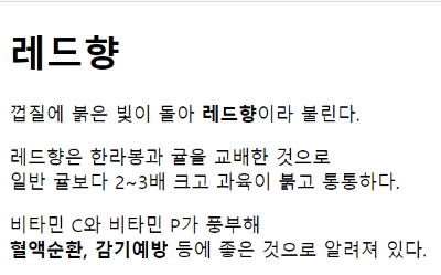 <p>껍질에 붉은 빛이 돌아 <b>레드향</b>이라 불린다.</p>