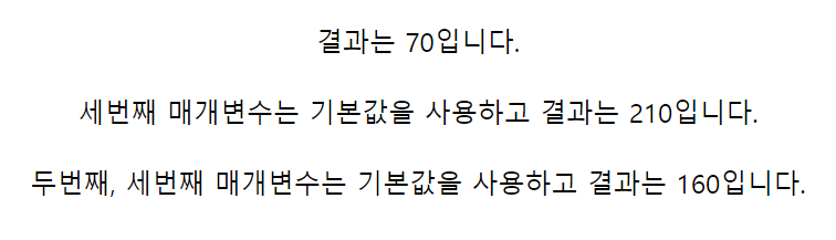 document.write("세번째 매개변수는 기본값을 사용하고 결과는 " + result2 + "입니다.<br><br>");