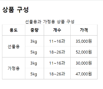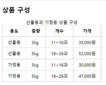 <caption>선물용과 가정용 상품 구성</caption>